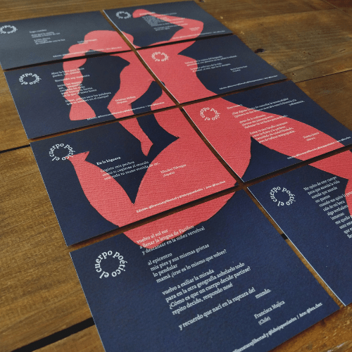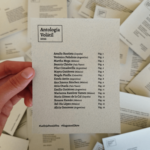 La Hoja Poesía Viva es un proyecto dedicado a promover la creación poética y la autoedición. Nos gusta publicar en diversos soportes, como camisetas, postales y carteles. Hacemos talleres en los que alentamos a la gente a seguir apropiándose del lenguaje y a crear con los recursos que tengan a la mano. Tenemos tres antologías: El poema en el Pecho (publicada en camisetas, con textos de poetas de distintas partes del mundo), Antología Volátil (publicada en postales, con autoras de España, México, Argentina y Colombia) y El Cuerpo Poético (un cartel desarmable, con textos de escritoras de Latinoamérica y España).